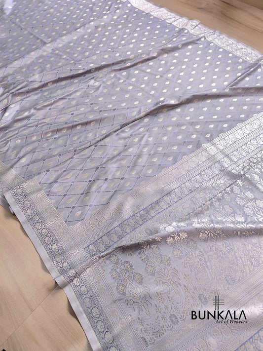 Silver Grey Pure Katan Silk Silver Zari Brocade Meenakari Handloom Banarasi Saree