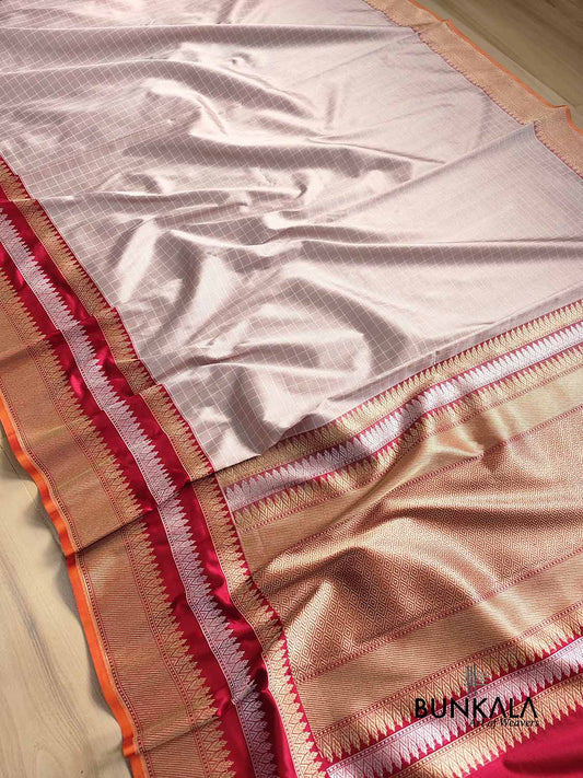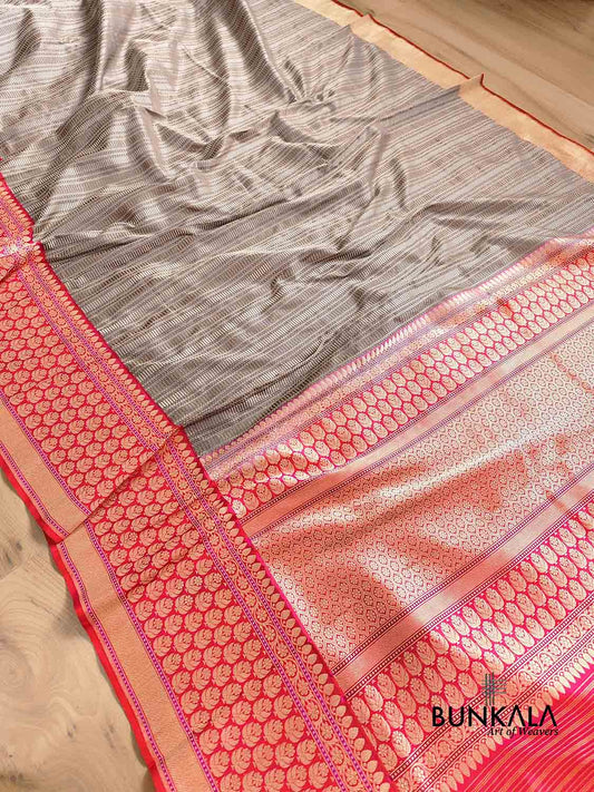 Metallic Grey Pure Katan Silk Checks Design Kadwa Handweaved with Contrast Red Kadiyal Border Banarasi Saree