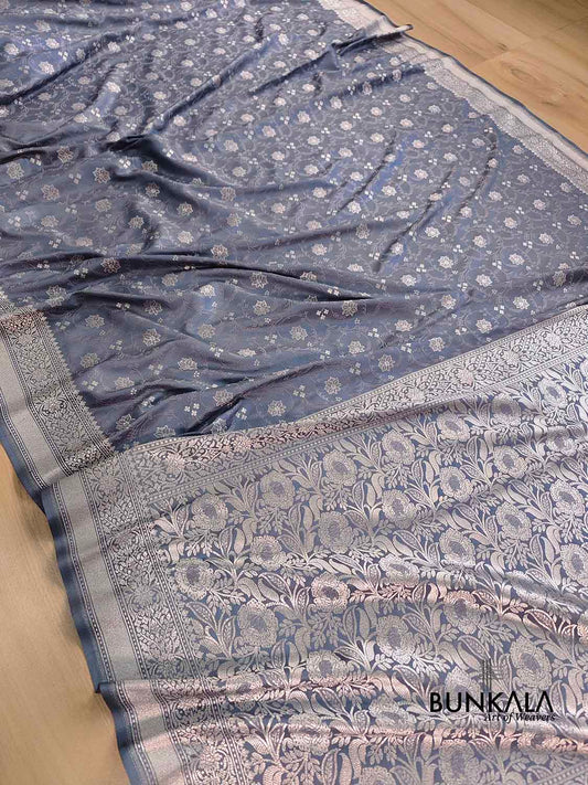 Grey Soft Mashru Silk Jamewar Weaved Floral Jaal Design Banarasi Saree