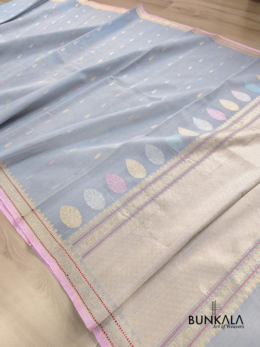 Greyish Blue Kadwa Buti Handweaved Banarasi Pure Linen Saree
