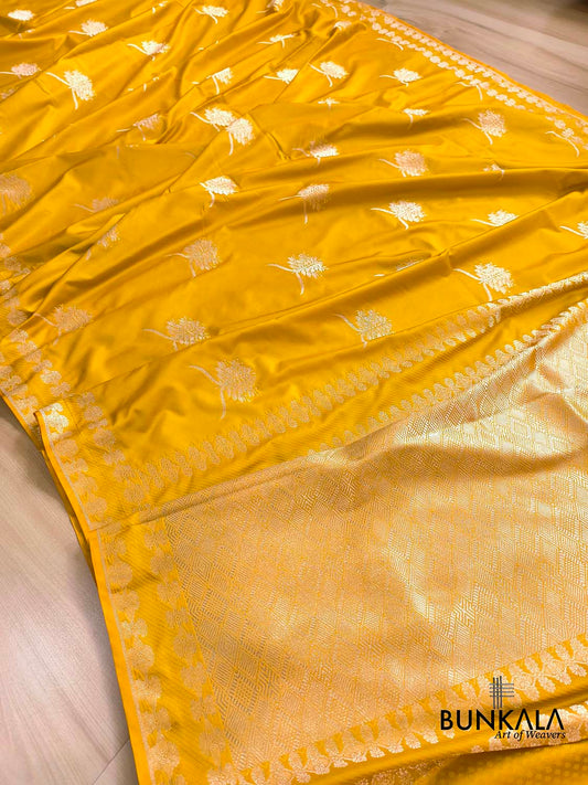 Dark Yellow Big Floral Jaal Banarasi Mashru Silk Saree