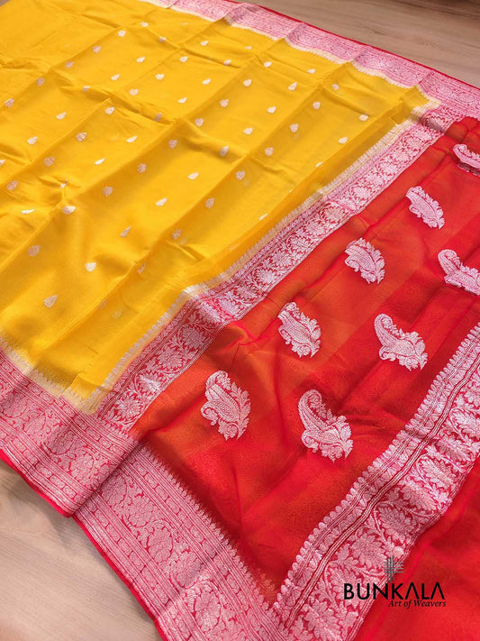 Yellow and Red Allover Silver Zari Buti Handloom Banarasi Pure Khaddi Chiffon Saree