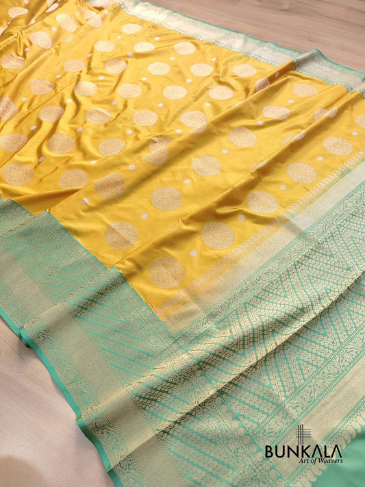 Mustard Yellow Kadwa Hand Weaved Big Round Buta Banarasi Pure Katan Silk Saree Contrast Border