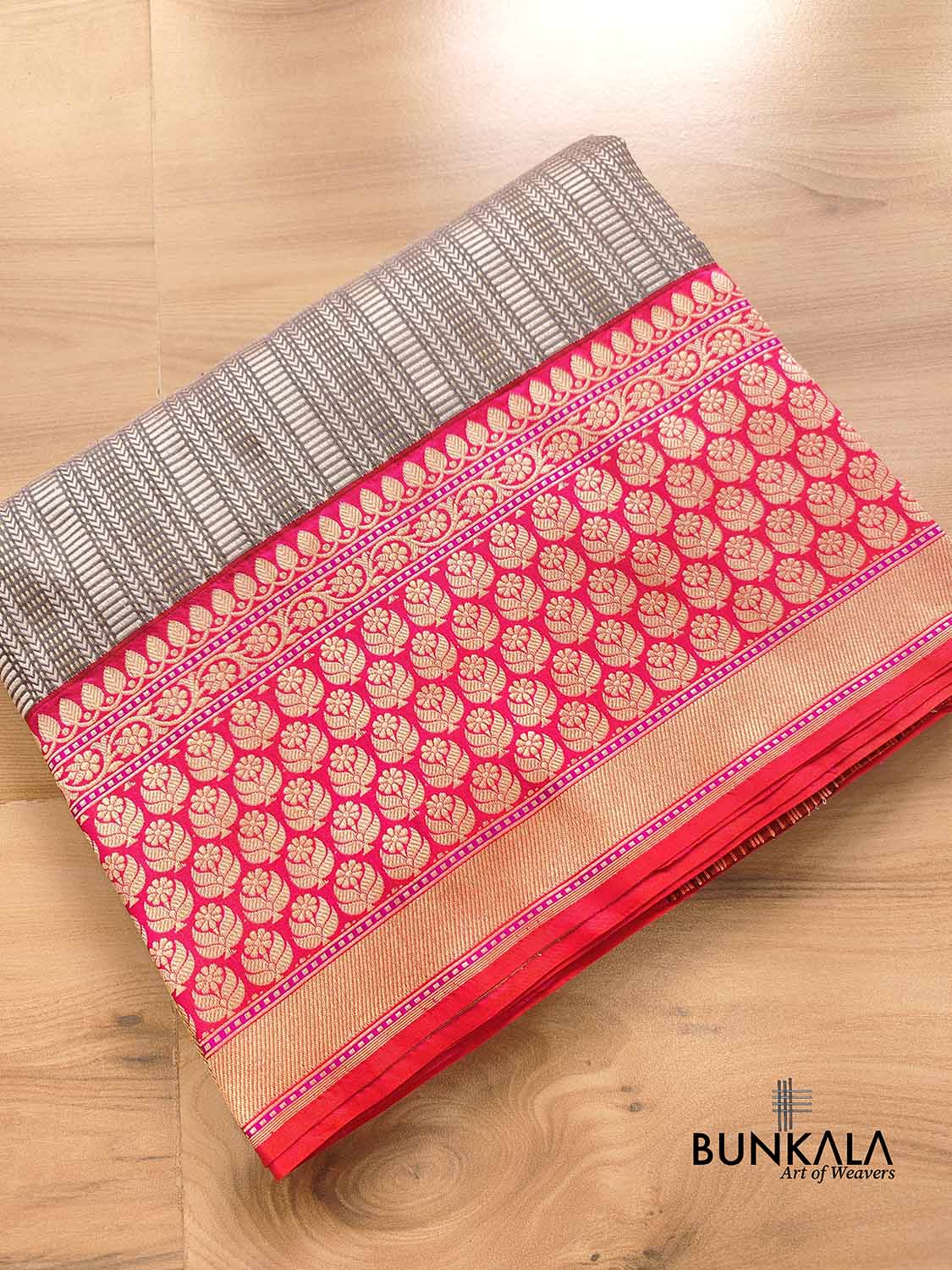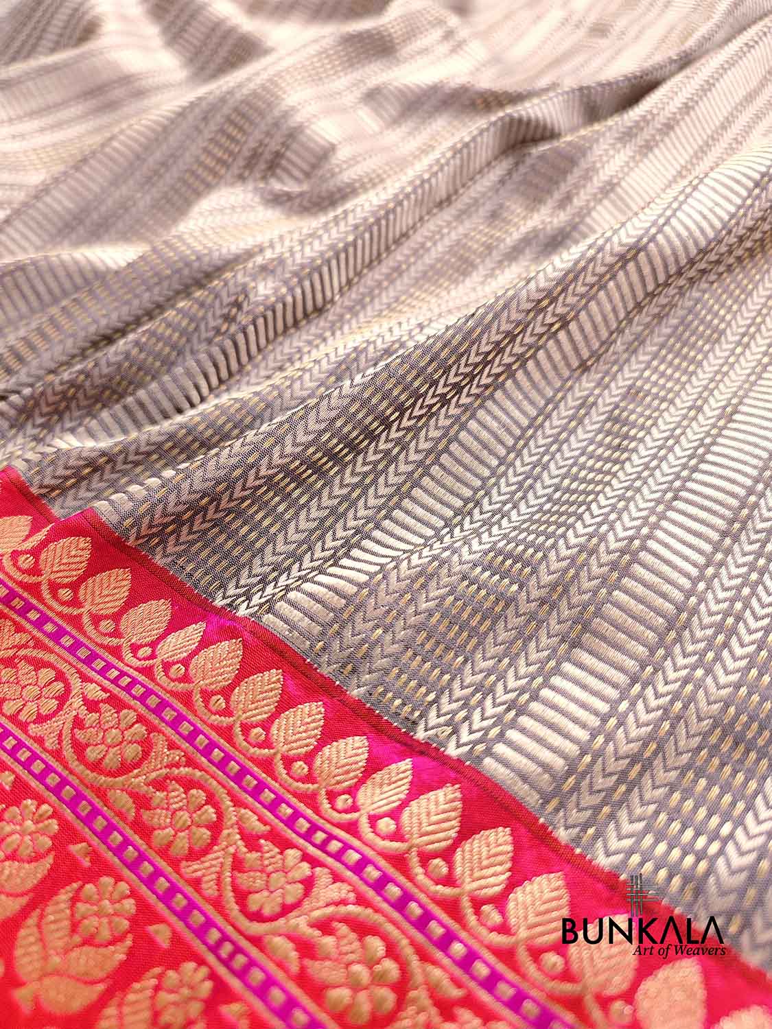 Grey Pure Katan Silk Geometrical Design Handweaved Silver Tanchui Body Banarasi Saree with Kadwa Handweaved Pink Contrast Border