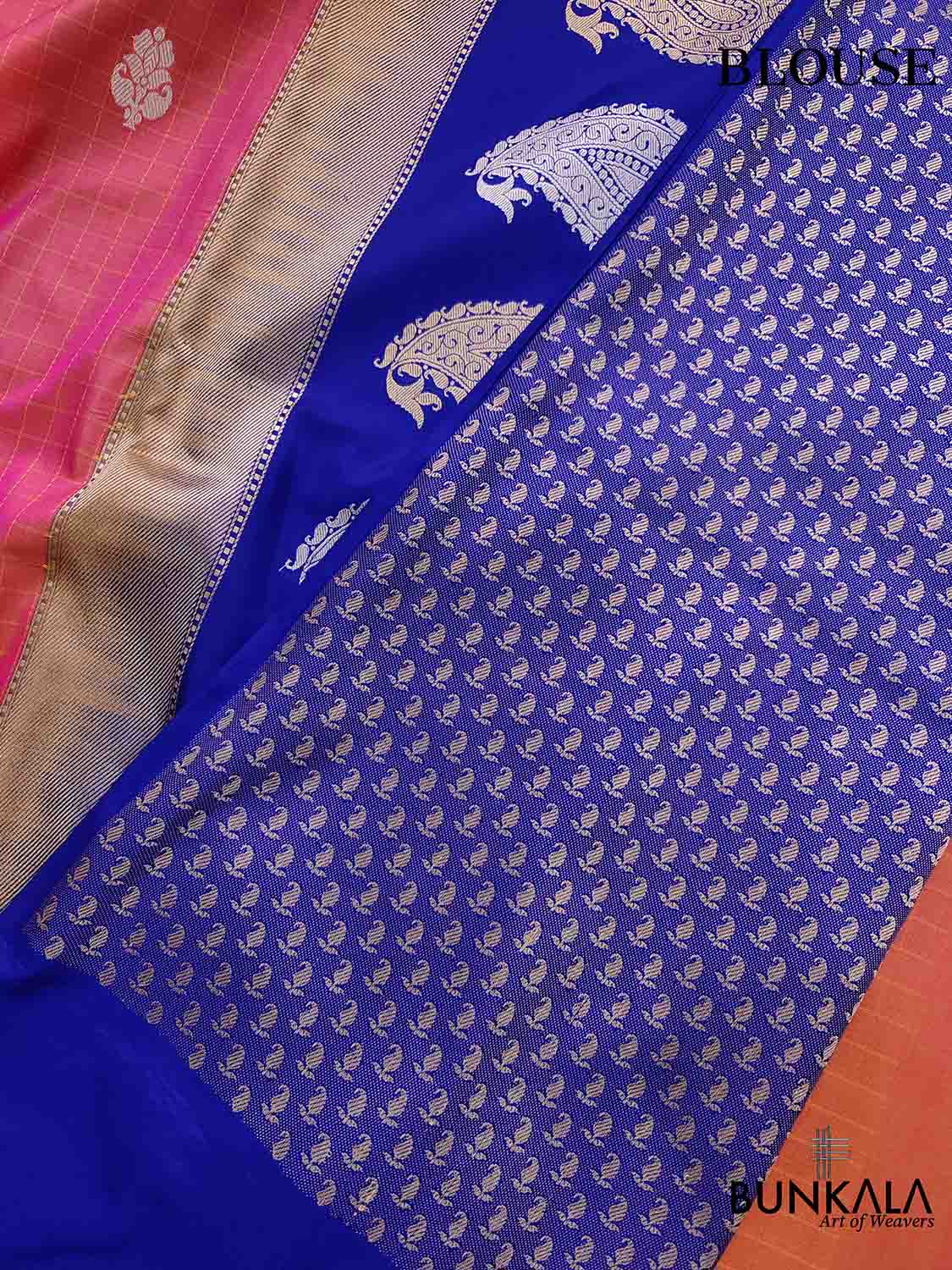Introducing the Pink Shot Color Pure Katan Silk Handloom Checks Design Allover Buti Banarasi Saree with Blue Contrast Border - a stunning piece of traditional Indian attire that is sure to turn heads at any event or occasion.